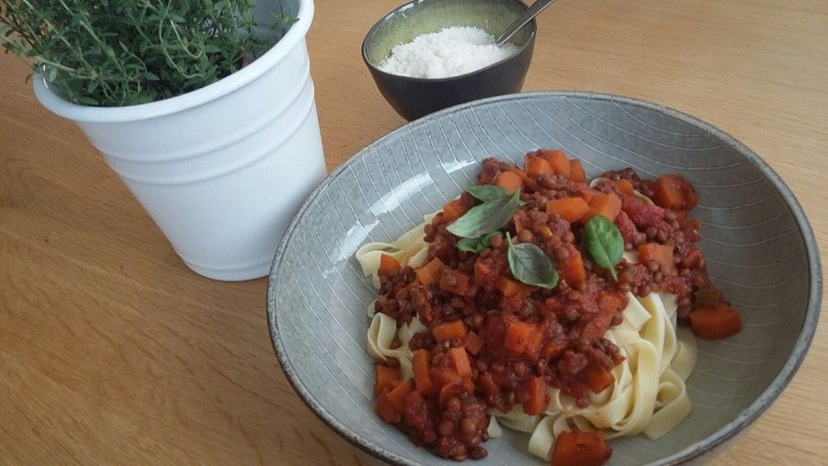300 g tageliatelle - 2 rode uien - 2 teentjes knoflook - olijfolie - 3 wortelen - 2 stengels selder - 300 g rode linzen uit blik - 150 ml groentebouillon - 2 laurierblaadjes - 800 g gepelde tomatenstukjes - peper - verse basilicum - gedroogde Italiaanse kruiden o.a. tijm, rozemarijn, basilicum ...